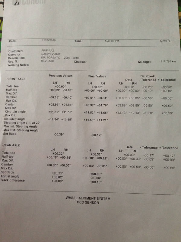 После замены сайлентблоков нижних передних рычагов у официалов делали сход-развал также у официала. Сказали что схождение и кастор выставиили, а развал не получилось сделать. Вот распечатка результатов.