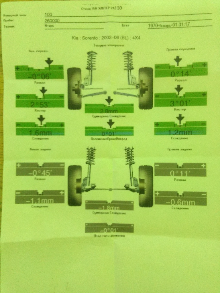 Чему удивляться, если на распечатке значения "разбросаны" в разные стороны. Да, они в допуске, но что мешает подвести к средним значениям? Да, не забудьте давления в шинах перед регулировкой проверить.