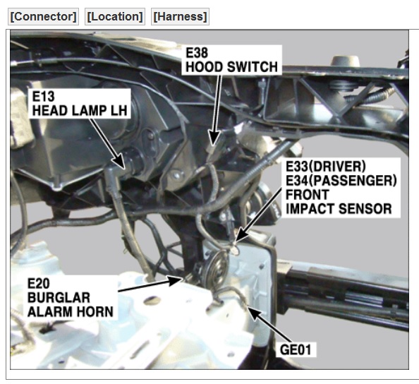 Какой сигнал и где стоит под передним левым крылом? Под крылом стоит пищалка системы Smart Key, которая орет если нажимать на кнопку двери, а ключ в машине. Кстати по схеме от этой пищалки масса тоже идет в этом жгуте на точку GE01.
