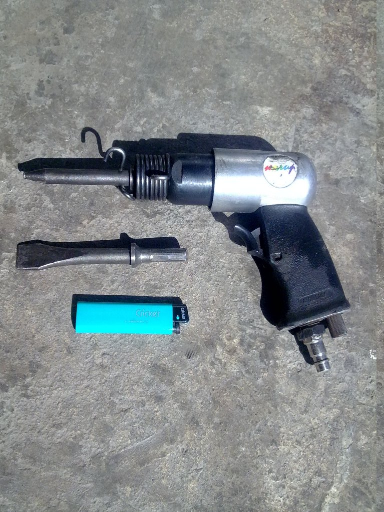 Прикрепил изображения. Оказалось это пневмо-инструмент. Плюс что-то похожее на зубило, но только оно вставляется в пробку, а не работает как зубило, и крутится там. Короче работа похожа на перфоратор, только помощнее (хотя перфораторы разными бывают)... Лупит по направлению в разброс. Т. е. по разным концам "зубила". Но попросил попробовать - этого не заметил. )) Работает как инструмент для откручивания гаек на колесе. )))
