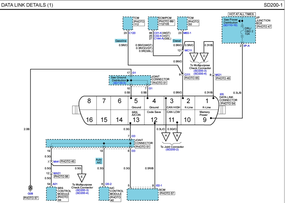 Аналогично. Подушки и кондиционер читаем с 13 контакта, abs с 1-го. BCM не читается. Нумерация контактов для схемы из GDS