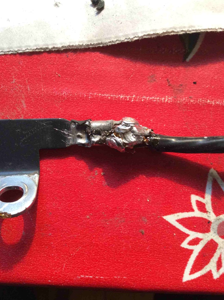 Явно видны следы перегрева провода, изоляция крошится. Сам провод растрёпан. В месте обжима шины внутри черная грязь.