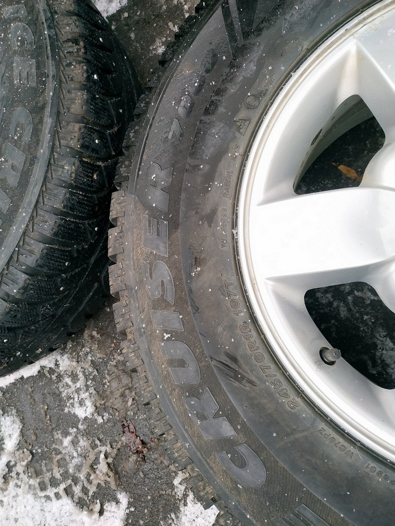 Резина Bridgestone Ice Cruiser 7000 245/70 R16 107T зимняя шипованная - БУ сезона 4 не очень интенсивно. На двух колесах (стояли спереди) шипов осталось процентов 60, на двух других пожалуй 90%.