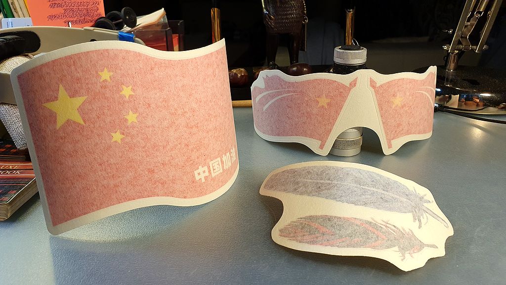 Китайцы, в качестве презента, вместе с комплектом наклеек прислали ещё три наклеечки - китайские государственные флаги. Два развевающихся на ветру, как у пиндосов на Луне. И один строгой волной. Я видел на трубе, как китайцы такой флаг наклеивают на кожух запаски. Ну что поделаешь - патриоты. И им есть чем гордиться нынче. Положил в ящик письменного стола. На память. Всё равно запаски сзади нет. :D