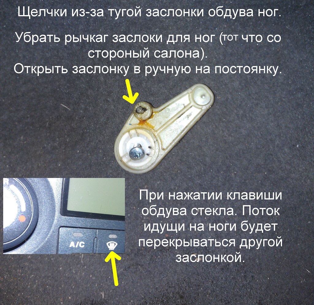 Вот теперь понятно,а точнее: поставить обдув в ноги,снять моторчик,снять этот рычаг совсем,поставить всё на место... :wink: