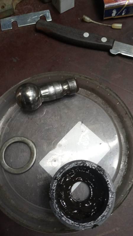 После того, как срезал борт посадочного места пыльника, палец и пластиковая втулка выпали сами из корпуса. Заглянув внутрь корпуса шаровой в нем отчетливо видно центр набитый родным пальцем.