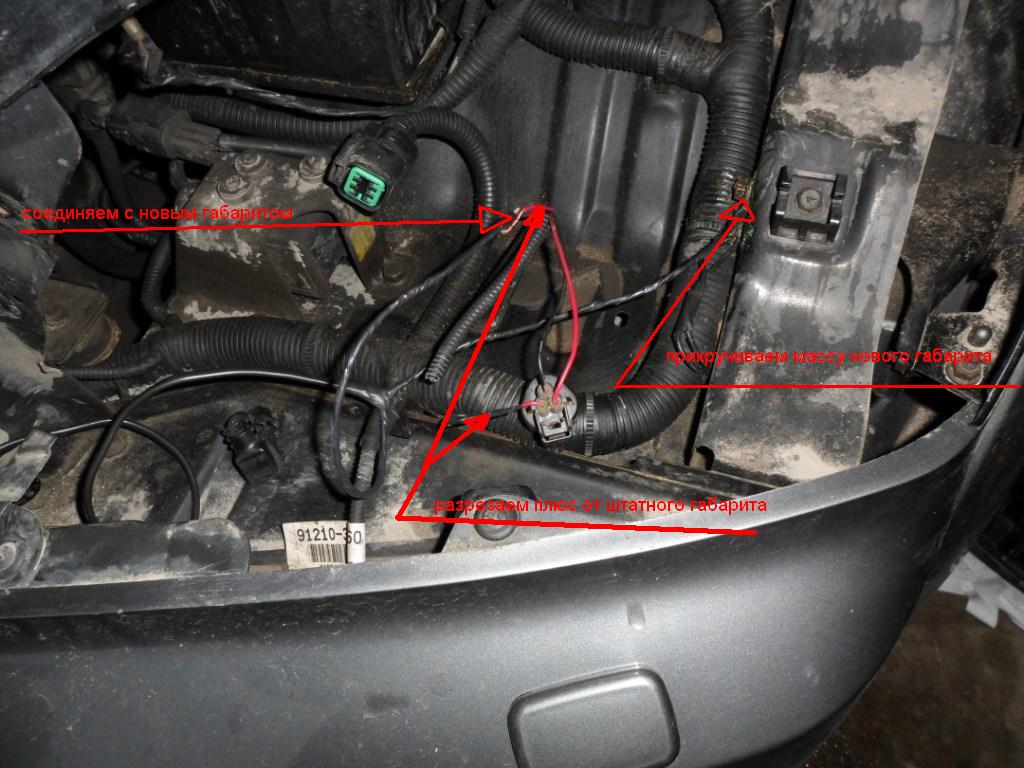 Разрезаем плюс штатного габарита и соединяем его с проводом нового габарита. Второй провод от нового габарита (с колечком ) прикручиваем к массе согласно фото.