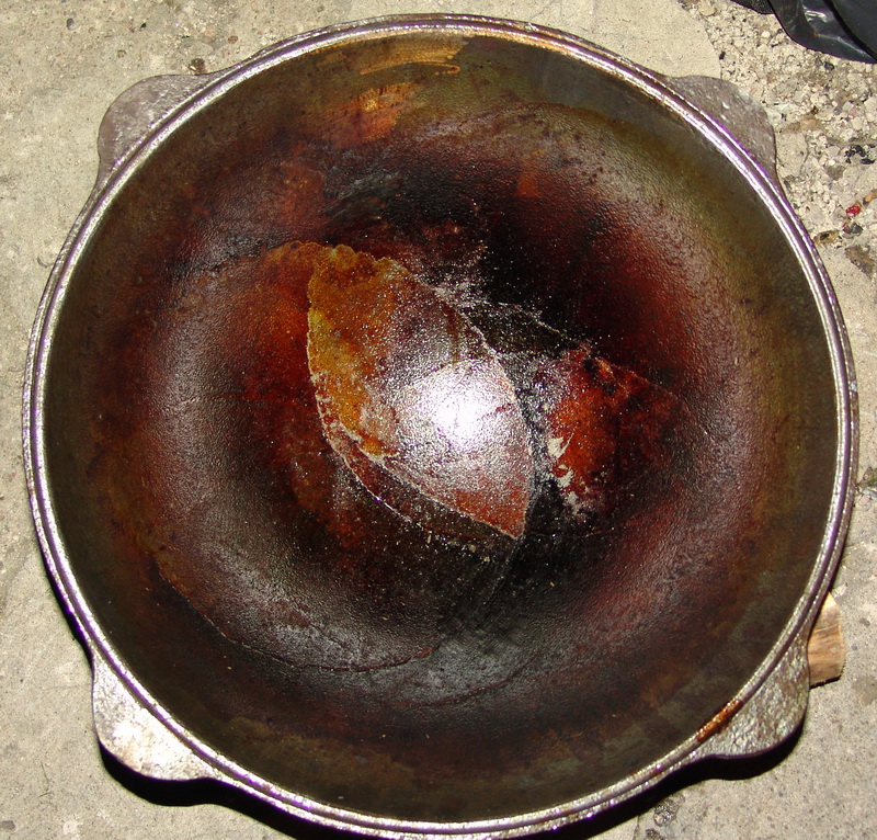 Потом налить целый казан воды и влить в воду стакан подсолнечного масла, прокипятить и слить. Все, готов к работе казанчик.