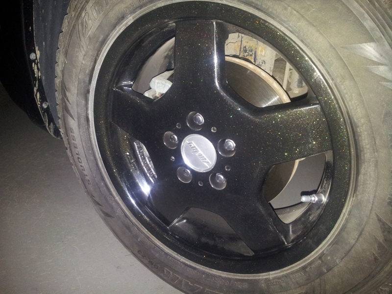 Пришлось разбортовать, отпескоструить, закатать полимеркой в 2 слоя: чёрный глянец, а затем лак с золотыми блёстками.